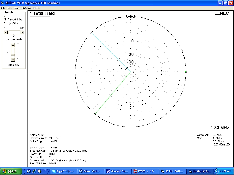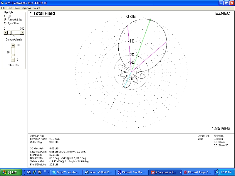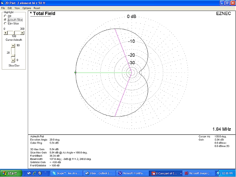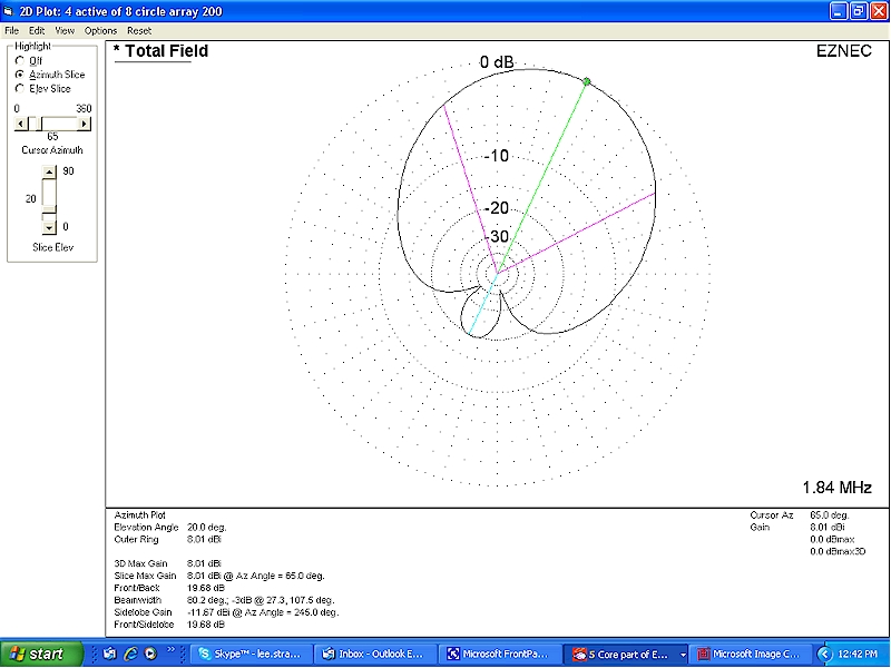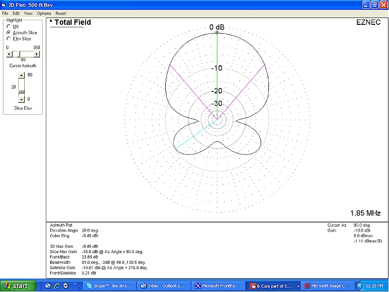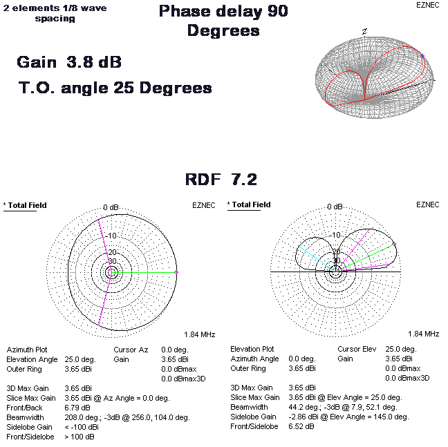 Animated 2 element array comparison. Two Hi-z elements spaced 1/8 wavelength with varying phase delay.